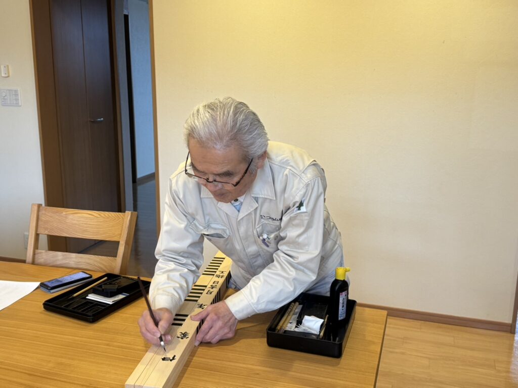 上棟飾りの裏面に上棟の月とお施主様のお名前を記す役目は、いつも会長が担っています。