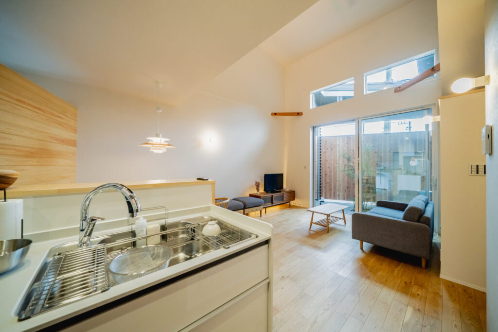 1. 視線が抜ける中庭と吹き抜け リビングの隣には開放感たっぷりの中庭 。そして天井を見上げれば大きな吹き抜け 。視線が外や上へ抜けるので、実際の面積以上の開放感を味わえます。
