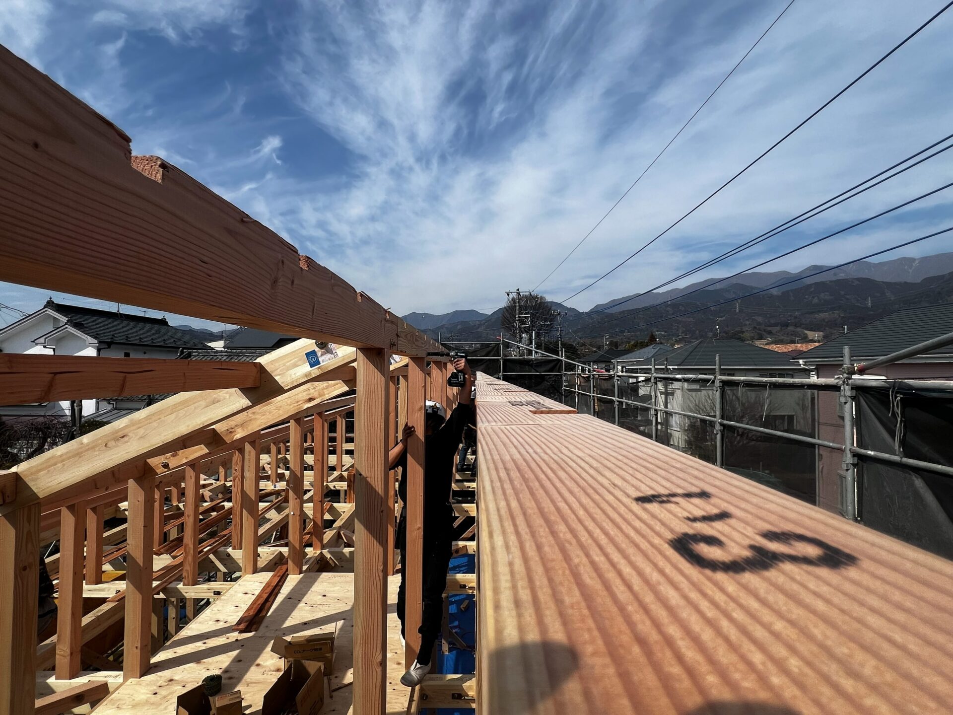 上棟という特別な日は天候にも恵まれ2月の中でも暖かい陽気の中行われました。